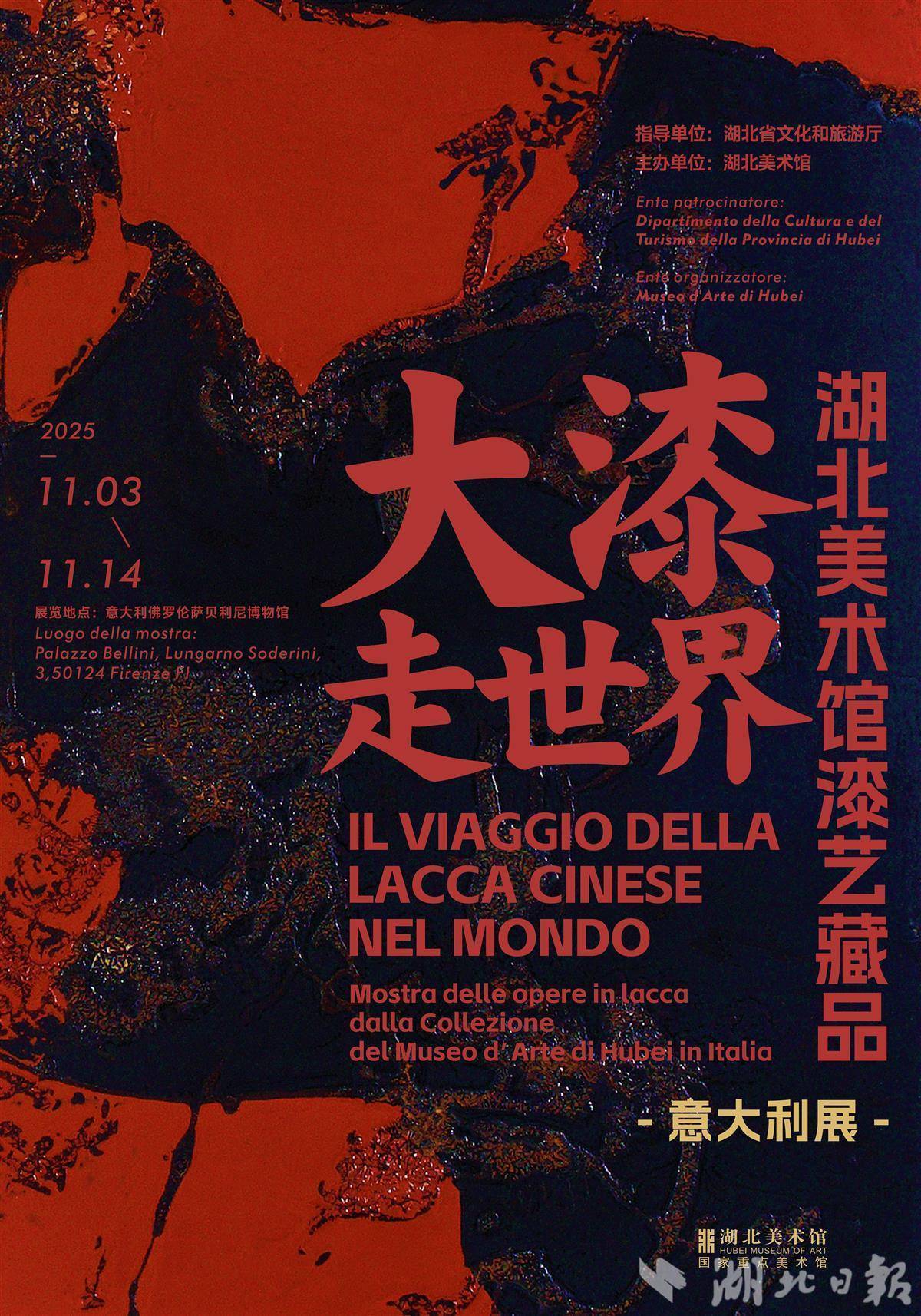 据悉,为推进大漆艺术的创造性转化、创新性发展,湖北美术馆打造了具有国际影响力的品牌展览“湖北漆艺三年展”,从2010年创办至今,已成功举办五届,并形成大漆艺术的特色收藏。同时,以湖北美术馆馆藏漆艺作品为基础,推出“大漆走世界”文化交流项目,曾赴埃及、韩国、德国、卢森堡等地交流展出,获得了良好的国际影响和社会效应。湖北美术馆曾先后推出多个意大利艺术专题展览,包括“光的现代性——1850—1950意大利托斯卡纳油画展”“突如其来——意大利当代艺术展”以及“意大利当代艺术家约利佐·米开里罗油画展”等。这些展览不仅呈现了意大利从历史到当代的多元艺术风貌,更搭建起一座跨越时空的对话之桥,让湖北的观众得以近距离欣赏意大利艺术家的精彩创作。