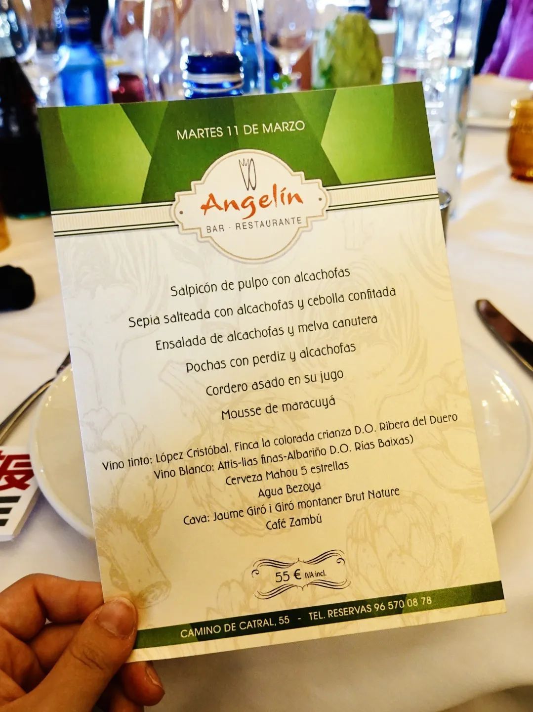 作为从没吃过(且听过)的中国人,这次我们在阿利坎特省的Angelín餐厅(Almoradí),吃了次“全洋蓟宴”。这家店每天都会更新不同的菜单,从前菜到汤再到主菜,所有菜都用洋蓟作为原材料之一。