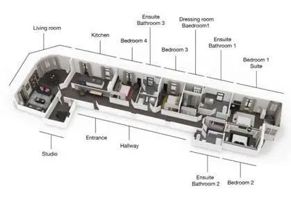 200平方的大平层,客厅、厨房、洗衣房一应俱全,一共有5间客房,其中包括一个主卧、三个次卧,还有一个studio。非常适合亲子游的家庭入住。