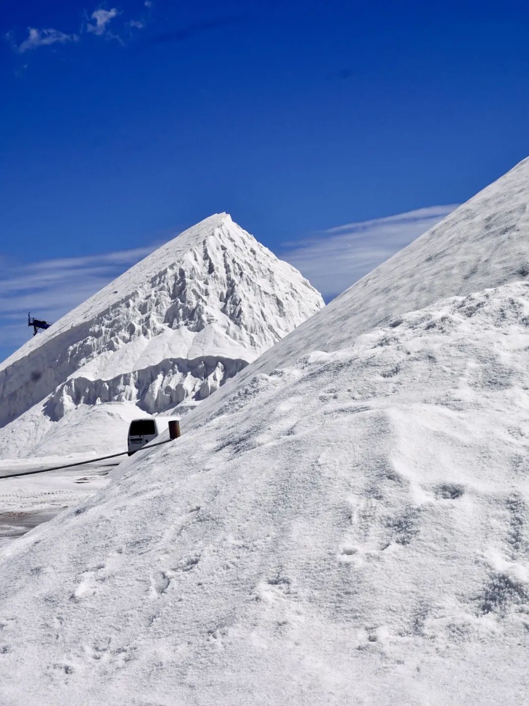 整个盐湖其实是一个工业区,堆着十几座高高的雪白盐堆,远看还以为是一座座雪山。走近一摸,才发现是手感坚硬的粗盐粒。